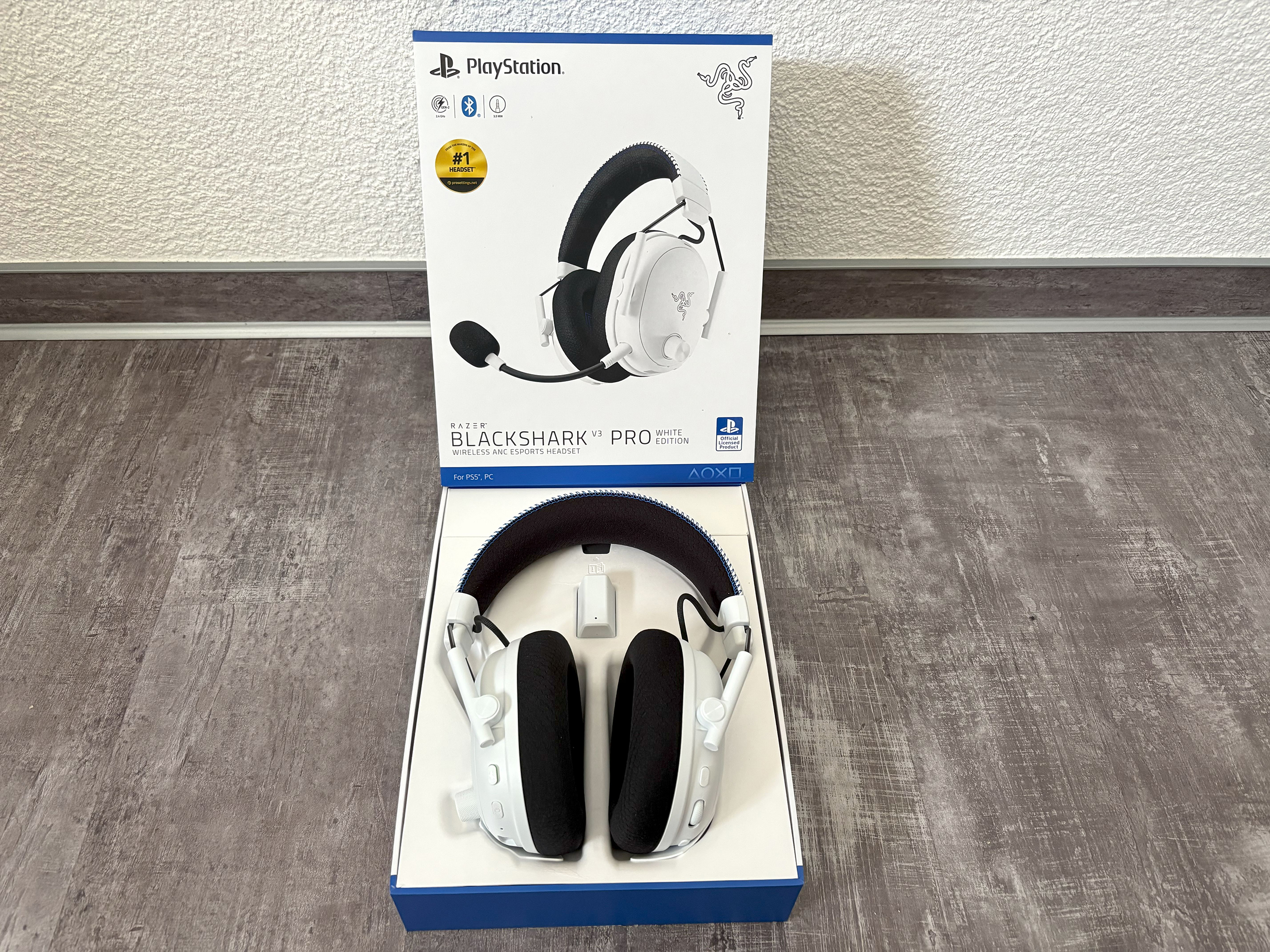 Das Headset ist mit dem neuen Razer HyperSpeed Wireless Gen-2 Dongle ausgestattet. Dieser bietet eine Latenz von nur 10 Millisekunden. Das ist besser als beim Vorgänger und besser als bei der Mehrheit der Konkurrenz. Ob das beim Spielen tatsächlich einen riesigen Unterschied ausmacht, bleibt aber fraglich – zumindest für den durchschnittlichen Spieler dürfte das keine große Rolle spielen. Viel wichtiger ist die Bedienung. Und an dieser Stelle wird es schwierig. Denn der Dongle arbeitet auf der 2,4-GHz-Wireless-Basis. Via Bluetooth lässt sich das Headset nämlich nicht mit einer PS5 oder PS5 Pro verbinden. Sony erlaubt es Drittanbietern nicht, die Verbindungsprotokolle zu nutzen. Zwar wird das Headset erkannt, aber es erscheint sofort die Mitteilung, dass solche Geräte nicht unterstützt werden. Somit fällt die Bluetooth-Verbindung schon mal aus. Es bleibt nur die Verbindung via Klinkenstecker am DualSense-Controller oder eben über den Dongle. Normalerweise steckt man es an einen USB-Port der Konsole und los geht’s. Das Dongle des Blackshark V3 Pro sieht anders aus als das des Vorgängers und kann nicht direkt an die Konsole angeschlossen werden. Dafür wird ein Kabel benötigt, das mitgeliefert wird. Es handelt sich um ein Kabel von USB C auf USB A.
