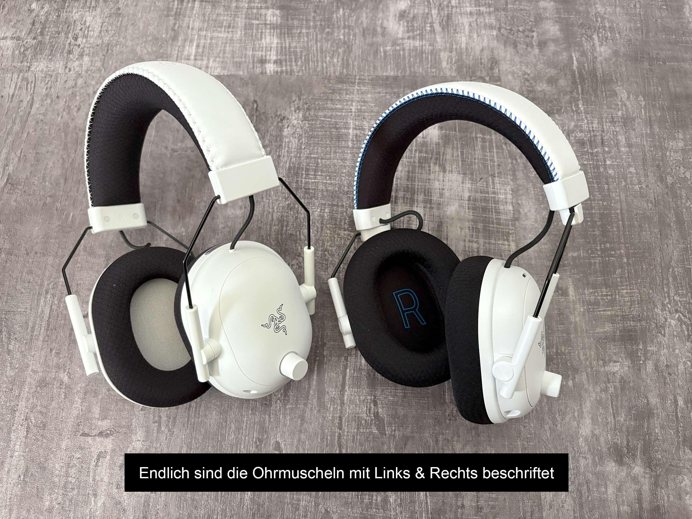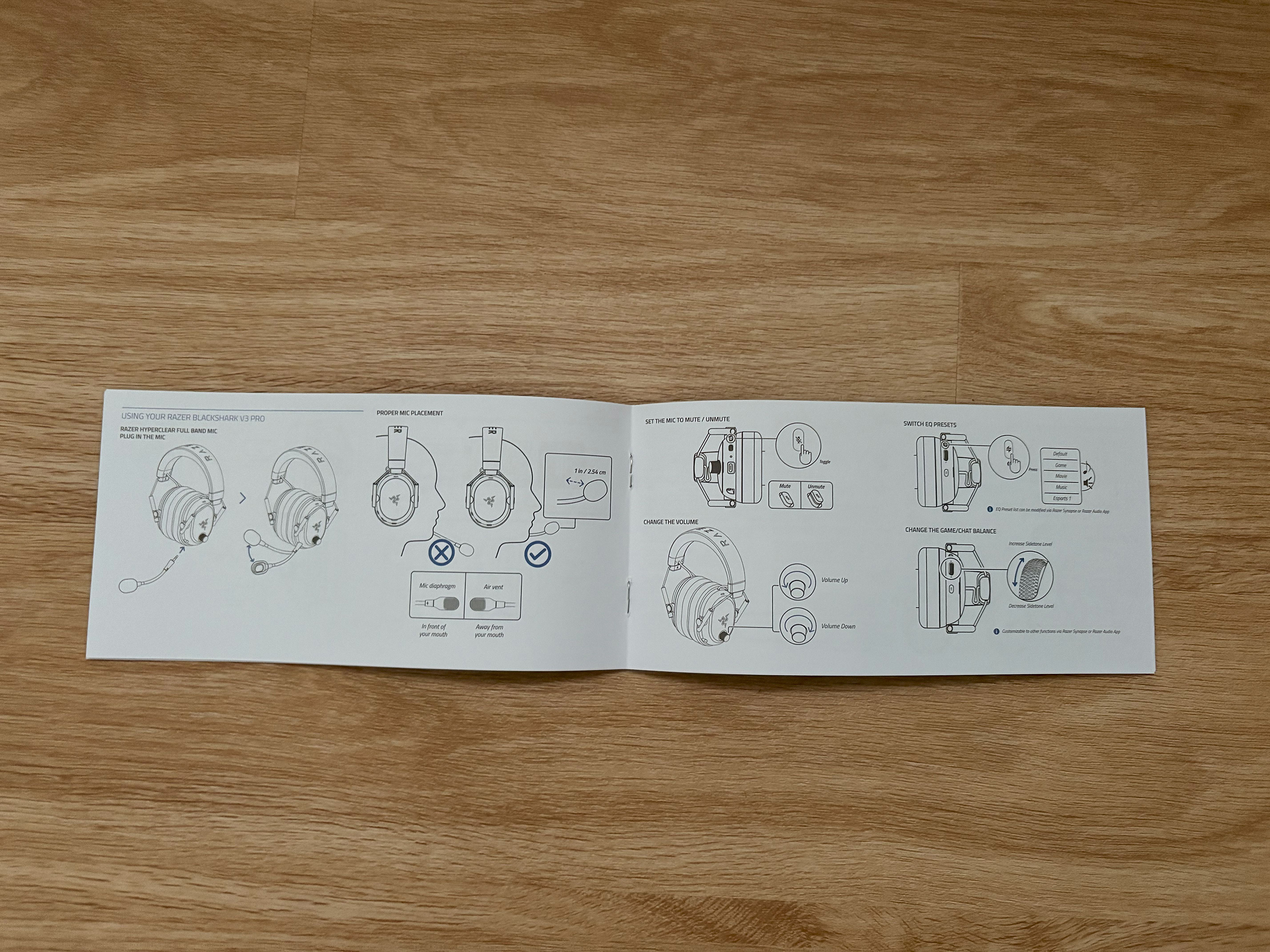 Das Headset macht einen wertigen Eindruck. Nichts fühlt sich billig an und es sitzt auch gut. Im Gegensatz zum Vorgängermodell lässt sich der Mikrofonarm jetzt auch blind einstöpseln, da der Anschluss spezifisch geformt ist. Durch einen Aufdruck an den Ohrmuscheln sieht man jetzt auch, was rechts und was links ist. Mit 367 g ist das Blackshark V3 Pro kein Leichtgewicht, aber das Gewicht bewegt sich noch im Rahmen. Das Headset sitzt ordentlich auf den Ohren und der Bügel drückt nicht, obwohl er dünner gepolstert ist. Der Ein-/Aus-Schalter ist übrigens ebenfalls blind ertastbar, da er eine geriffelte Oberfläche aufweist. Ansonsten gibt es auf der Seite noch einen Knopf, um das Mikrofon stummzuschalten, einen Drehregler für die Lautstärke und einen winzigen LED-Indikator mit drei Farben: Grün bedeutet Wireless-Verbindung, Blau Bluetooth und Weiß, dass beide verbunden sind. Zudem gibt es einen USB-C-Anschluss zum Laden des Akkus. Auf der anderen Seite befindet sich der SmartSwitch-Knopf. Durch einmaliges Drücken schaltet man durch die gespeicherten EQ-Profile (bis zu 9 Stück) und durch einen Doppelklick wechselt man die Verbindungsmodi (Wireless, Bluetooth, simultanes Audio). Dann gibt es ein Drehrad, das auch programmierbar ist. Standardmäßig ist die Mic-Sidetone-Funktion hinterlegt, aber über die Synapse-App kann man auch andere Funktionen hinterlegen/steuern, z. B. die Fußstapfen-Skalierung. Zu guter Letzt gibt es noch einen Knopf für das ANC.