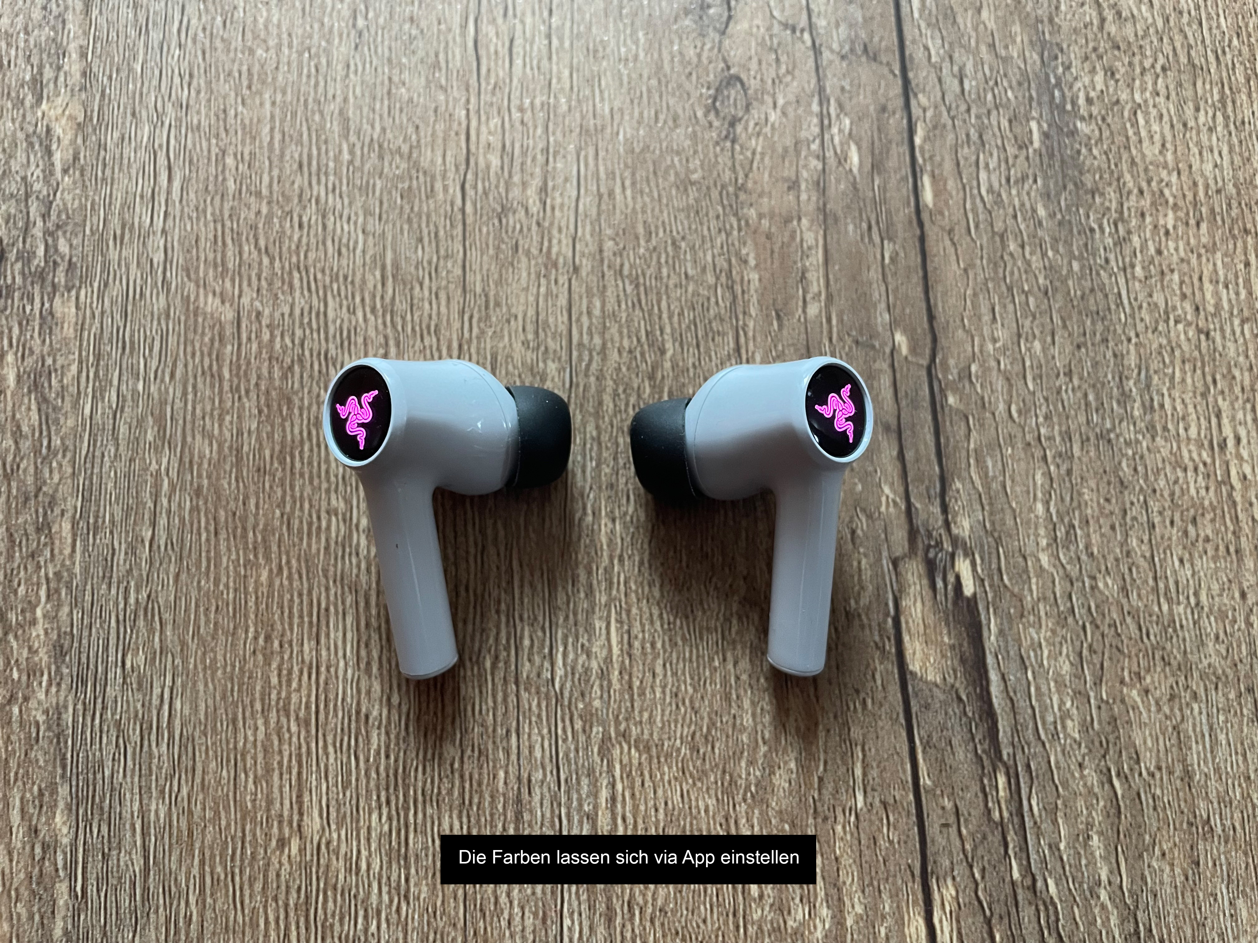 Klappt man das Case auf, aktivieren sich die Earbuds, klappt man es zu, gehen sie aus. Ebenfalls gehen sie automatisch aus, wenn über eine bestimmte Zeit keine Verbindung zu einem gekoppelten Gerät besteht. Die eigentlichen Ohrstöpsel orientieren sich am Design der Apple Air Pods – sprich es gibt einen handlichen Stiel, durch die man die Geräte problemlos in die Ohren und natürlich wieder rausbekommt. Ich hatte vor einiger Zeit die Epos GT270 Earbuds getestet und da war die ganze Handhabung wesentlich fummeliger. An jeweils einer Seite befindet sich das typische Razer-Logo, welches dank Chroma RGB farblich an den eigenen Geschmack angepasst werden kann. Dazu braucht man allerdings die Razer App. Hier kann man neben dem Chroma-Effekt auch noch eine „Bitte nicht Stören“ Option aktivieren, sowie im Equalizer herumspielen und die aktive Rauschunterdrückung (ANC) dazu schalten. Ebenfalls sieht man den Akkustand der Earbuds und es lässt sich eine optionale dt. Sprachausgabe als Ansagesprache auf die Stöpsel herunterladen. Zudem gibt es ein Gesten Tutorial bzw. die Möglichkeit der Neubelegung der Aktionen.