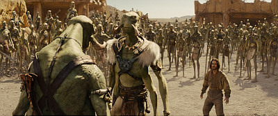 Wie man schon anhand der Inhaltsangabe sieht, ist die Story ein ziemlicher Wirrwarr, zumal man lange braucht um überhaupt erst mal herauszufinden wer gegen wen und warum eigentlich kämpft. Hinzu kommen Dialoge aus der Soap Hölle, was die so schon wirre Story noch anstrengender macht. Wenn schon nicht ins Script, wohin sind wohl dann die Millionen geflossen? Immerhin liegt "John Carter" mit seinem Budget in den Top 5 der teuersten Filme aller Zeiten. Doch leider kann der Schauwert auch nicht vollends überzeugen. Zwar gibt es mehr als genug Potential, doch wird dieses so gut wie nie ausgeschöpft. Da bewegt sich zwar eine riesige Stadt auf Stahlstelzen gemächlich durch die Einöde, doch bis auf ein paar Sekunden sieht man davon nicht viel. Aber auch die Luftkämpfe mit den fantasievollen Fluggeräten (fliegen mit Sonnen-, bzw. Mondlicht) sind viel zu spärlich ausgefallen. Immerhin geht der Film über zwei Stunden! Der Rest plätschert ohne große Höhepunkte vor sich hin. Immerhin gibt es ein paar schöne Landschaftspanoramen zu bestaunen.