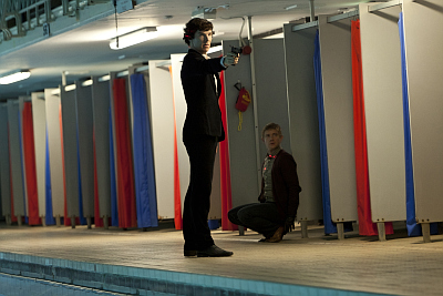 Zwar spielt die Sherlock Reihe im Hier und Jetzt, doch bediente man sich munter an den vielen Vorlagen und schuf etliche Querverweise zu den Büchern, bzw. hat sogar mit dem Film „Die Hunde von Baskerville“ das entsprechende Buch als Vorlage genutzt. Wer die Bücher kennt, wird somit vieles auch in den Filmen wiederfinden, was die Serie für Fans enorm aufwertet. Als dies haben die Autoren Steven Moffat und Mark Gatiss gekonnt mit neuen Ideen verknüpft, wie zum Beispiel mit neumodischen Errungenschaften wie Mobiltelefonen. Aber auch die Charaktere bekamen eine Frischzellenkur und vor allem Sherlock Holmes wurde gegenüber der Originalfigur etwas abgeändert. Seine Drogenprobleme reduzieren sich jetzt auf Nikotinpflaster und er verhält sich recht arrogant gegenüber seinen Mitmenschen. Ihm sind die Leiden der anderen egal und ihn interessiert nur der Nächste Fall, bzw. das nächste Rätsel. Dies funktioniert jedoch dank Charaktermime Benedict Cumberbatch hervorragend, der voll und ganz in seiner Rolle aufzugehen scheint. Aber auch Dr. Watson (gespielt von Martin Freeman) wurde entsprechend angepasst und kommt nicht mehr so dümmlich wie in der Vorlage rüber, wenngleich sich Sherlock anfangs noch über ihn lustig macht. Wie erwähnt macht sich Sherlock gerne die moderne Technik zu nutze, was auch optisch sehr ansprechend inszeniert wurde. So sieht man SMSs oder die Gedanken von Sherlock immer wieder über den Bildschirm schweben. Aber auch der Witz kommt nicht zu kurz und vor allem die Dialoge zwischen Sherlock und Watson sind immer wieder zum Schmunzeln.