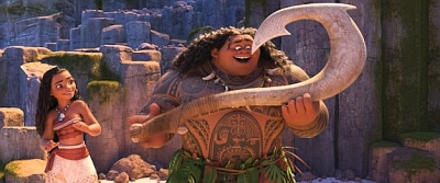 Klingt ziemlich vertraut. Oder? Die Geschichte eines Kindes, welches die Welt erkunden will, doch die Eltern es nicht lassen wurde schon mehr als einmal erzählt. Natürlich hat Vaiana auch mit allerhand Rückschlägen zu kämpfen, zweifelt an sich selbst nur um kurz darauf wieder zu sich selbst zu finden. Auch die Eltern werden einsichtig und alle leben glücklich bis ans Ende ihrer Tage. Ein bisschen erinnert dies auch frappierend an “Merida” aus dem Hause Pixar. Gähn! Na ja, letztendlich kommt dann aber zum Glück doch keine Langeweile auf, da die Geschichte ziemlich gut erzählt wird und an fahrt aufnimmt, wenn Vaiana nach kurzer Zeit Maui gefunden hat. Dieser stellt sich sogleich mit einem wirklich eingängigen Ohrwurm vor und lässt schnell erkennen, dass er so gar keinen Bock hat Vaiana auf ihrer Reise zu begleiten. Auch ist der Disney typische Sidekick dieses Mal pfiffiger als sonst ausgefallen. Zwar gibt es auch hier eine tierische Begleitung (so dumm, dass es schon wieder genial ist), doch gegen den Minihalbgott auf dem tätowierten Maui stinkt alles andere ab. So sind die Tattoos köstlich animiert und der Mini Maui hat eine Menge Lacher auf seiner Seite. Ebenfalls sehr positiv ist, dass man keine öde Liebesgeschichte rund um Vaiana geschrieben hat und sie somit stärker daherkommt als andere weibliche Disney Charakter. Optisch ging man ebenfalls einen erwachsenen Weg und gestaltete Vaiana normaler als bisherige Charaktere inklusive muskulöser Oberarme und ohne der immer gleichen Wespentaille. So hat man keine Probleme ihr die zahlreichen Actionszenen (eine sogar in bester “Mad Max”/”Waterworld” Manier) abzukaufen. Leider zünden aber nicht alle Gags und viele der popkulturellen Anspielungen verpuffen regelrecht. Und auch die immer gleichen Gags Richtung alter Disney Prinzessinnen kann man nicht mehr hören, da sie gefühlt in jedem Animationsfilm breitgetreten werden.