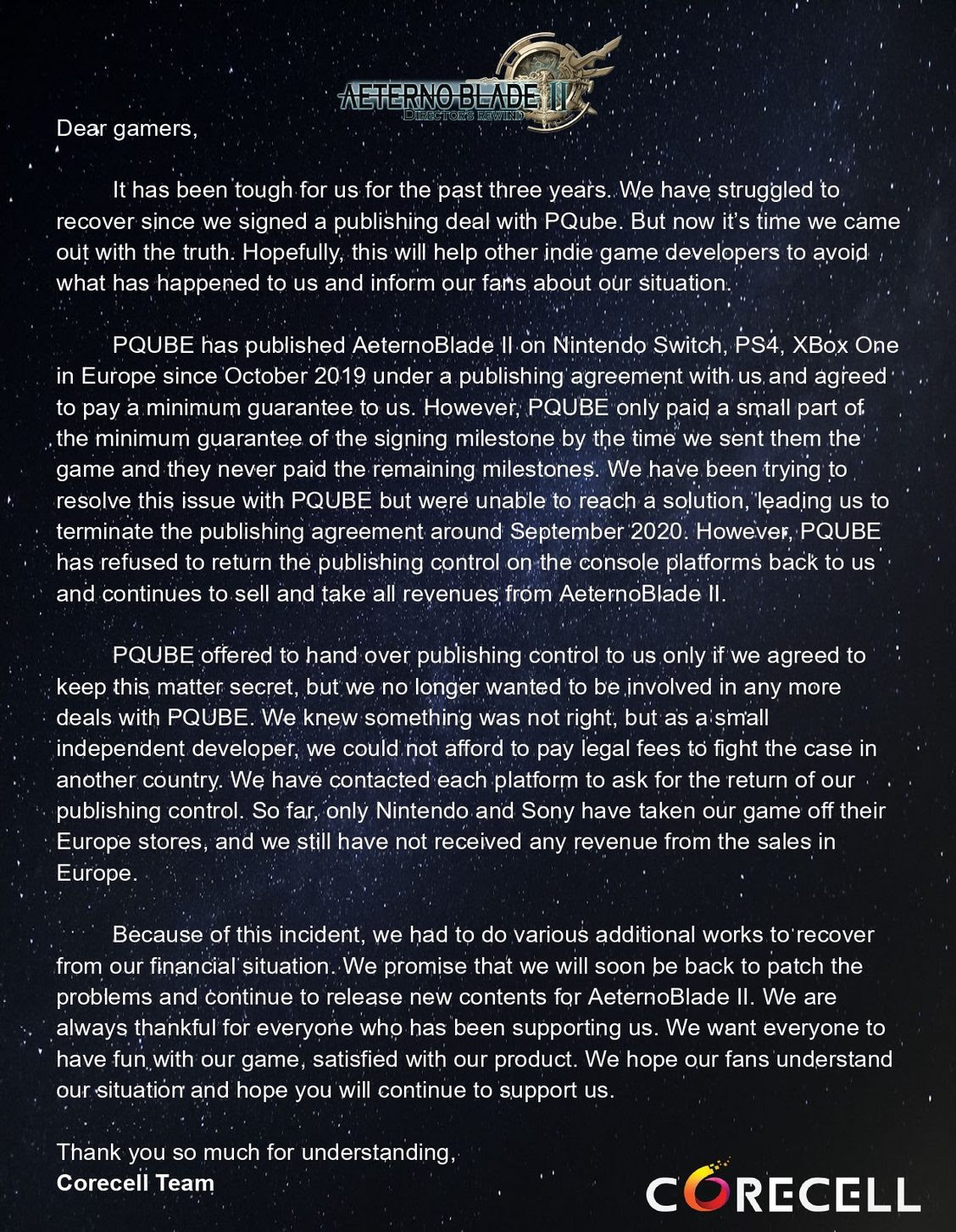 Nachdem dieser Zwist nicht aus der Welt geschaffen werden konnte, hat Corecell das Veröffentlichungsabkommen im September 2020 mit PQube gekündigt. Die Rechte an der Veröffentlichung wurden jedoch nicht an Corecell übergeben, so dass PQube weiterhin das Spiel in diversen digitalen Stores vertrieb. Daraufhin wandte sich Corecell an die Plattformhalter - Sony zum Beispiel nahm das Spiel daraufhin aus dem PlayStation Store.