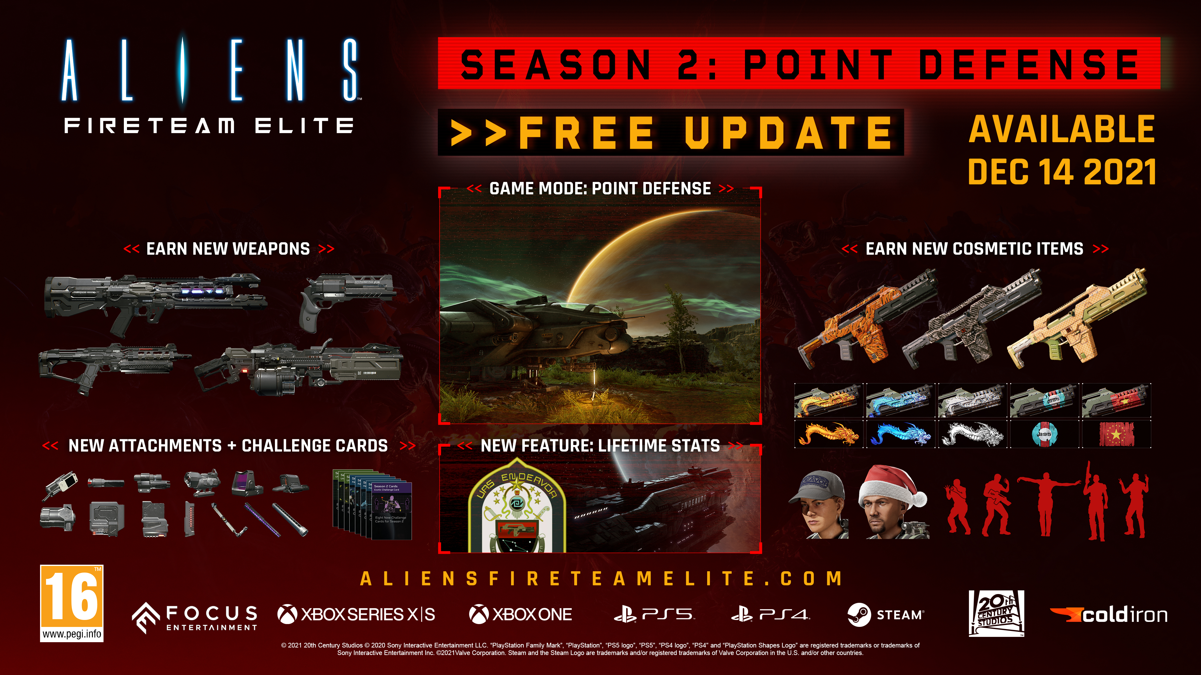 Nachdem im September Season 1: Phalanx erschienen ist, wird die neue Season kostenlose Items für alle Spieler beinhalten - mitsamt einem neuen Modus der auf den Namen Point Defense hört. Diese schnelle Alternative zum Horde Modus in eine neue Art von Survival Schlachten werfen, bei denen das Team drei strategische Punkte verteidigen, reparieren und halten muss, während die Xenomorph in Wellen angreifen. Spieler können sich verbrauchbare Items kaufen um die Chancengleichheit zu erhöhen. Verwendet werden dafür Punkte, die während der Spielrunden freigeschaltet werden und mit denen man bis zu 20 neue Belohnungen freischalten kann, wenn man alle Schwierigkeitsgrade meistert.