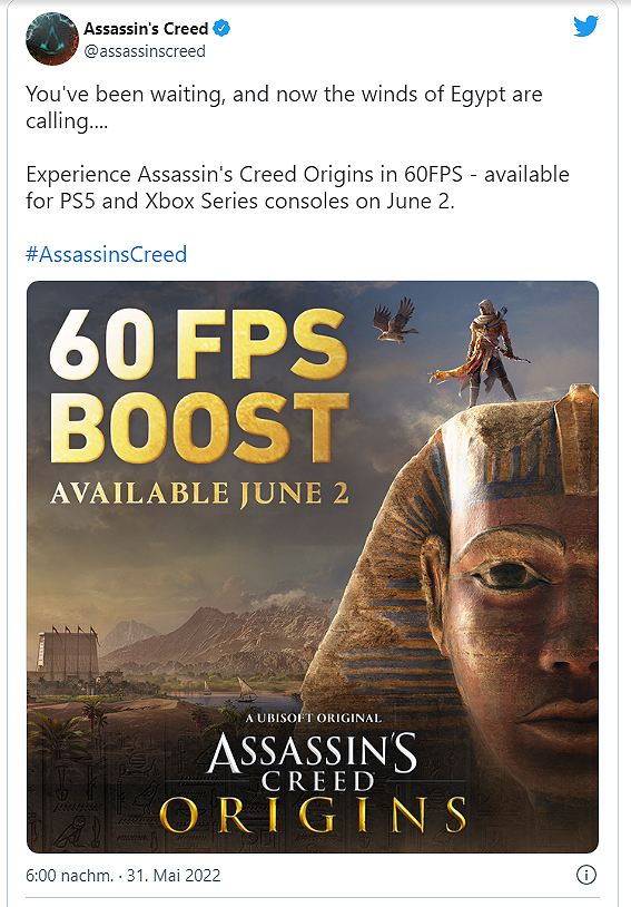 Ab dem 02. Juni wird man Assassin`s Creed Origins (also der Teil in Ägypten) auf einer PS5 mit 60fps Bildwiederholrate spielen können. Das gab Ubisoft nun via Twitter bekannt. Angekündigt war das Ganze bereits seit einiger Zeit, nachdem schon "Odyssey" mit einem Upgrade eine solche Option auf der PS5 spendiert bekam.