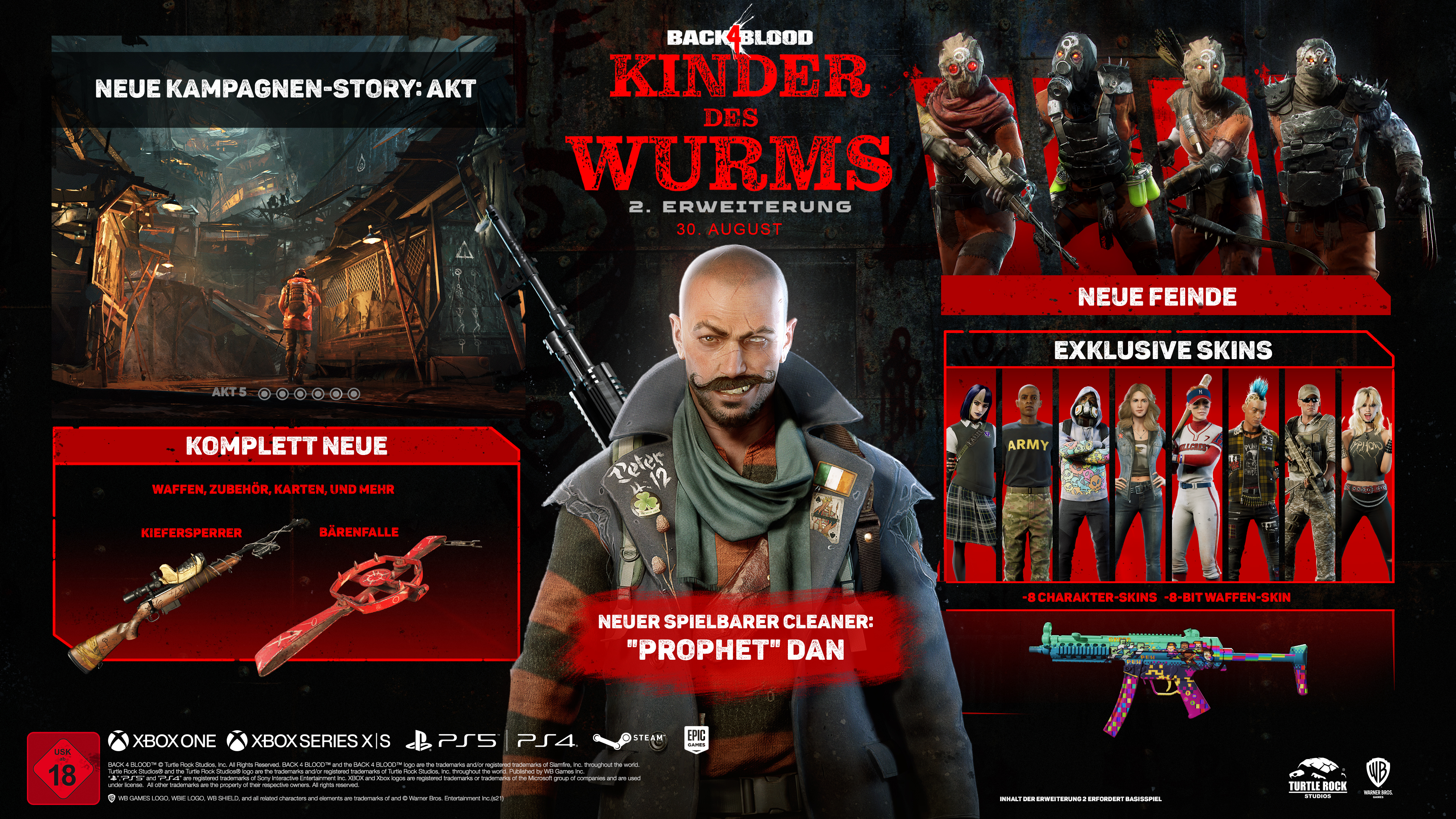 Warner Bros. Games und die Turtle Rock Studios haben erste Details zur nächsten Back 4 Blood-Erweiterung bekannt gegeben, die offiziell den Namen "Kinder des Wurms" trägt. Der kommende DLC wird voraussichtlich am 30. August 2022 als Teil des Back 4 Blood Annual Pass, der Back 4 Blood: Deluxe Edition und Back 4 Blood: Ultimate Edition, oder als separater Kauf erscheinen.