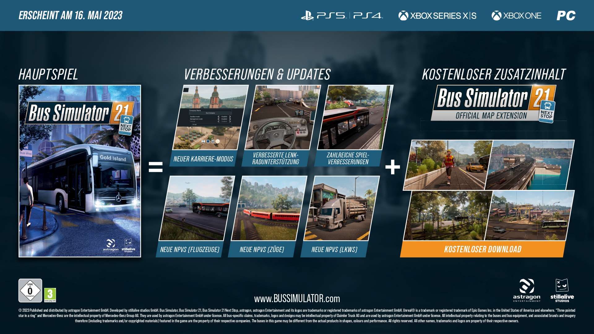 Publisher Astragon Entertainment und das Stillalive Studios Entwicklerteam freuen sich, heute das vorverlegte Releasedatum für Bus Simulator 21: Next Stop anzukündigen: Das große Next Stop-Update, die kostenlose offizielle Kartenerweiterung, die dedizierten Versionen für die PS5, sowie die Bus Simulator 21 Next Stop - Gold Edition werden eine Woche früher als ursprünglich angekündigt erscheinen. Der neue Releasetermin ist der 16. Mai 2023!