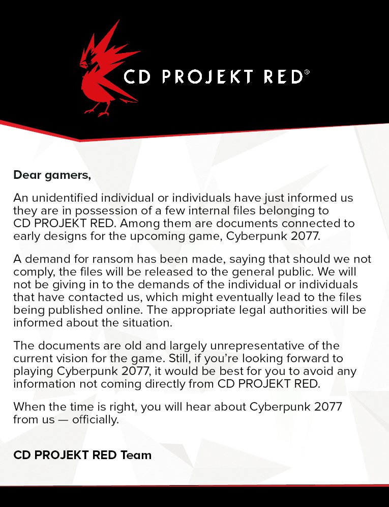 Holla die Waldfee! CD Project RED twitterte gerade eine ernsthafte Botschaft an alle Gamer. Und zwar geht es darum, dass das polnische Studio von Unbekannten erpresst wird. Und zwar soll Der / Die in Besitz von internen Designunterlagen zum kommenden Action RPG Cyberpunk 2077 vom Entwickler sein. Eine Lösegeldforderung wurde gestellt, ansonsten würden die Dokumente / Daten der Öffentlichkeit zugänglich gemacht werden.