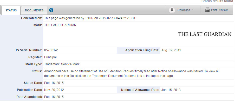 Doch nun ließ Sony Computer Entertainment den Markenschutz für den Titel in Amerika auslaufen, nachdem man diesen bereits drei von fünfmal verlängert hat. Bedeutet das nun das Ende für The Last Guardian? Sony hat sich bislang noch nicht dazu geäußert.