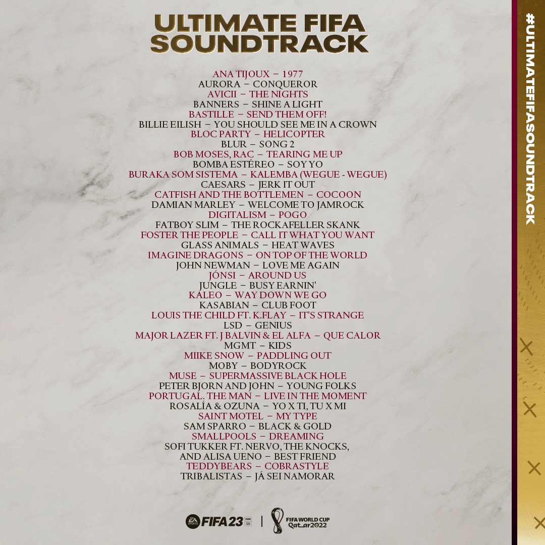 Electronic Arts kündigte heute den ultimativen FIFA-Soundtrack an, der in Zusammenarbeit mit Spotify nach einer ganzen Woche voller Nominierungen aus allen Ecken der Welt zusammengestellt wurde. Der ultimative FIFA-Soundtrack spiegelt den Weltfußball perfekt wider und umfasst eine noch nie dagewesene Zahl von 100 Lieder aus allen FIFA-Titeln der letzten 25 Jahre. Von den 100 auf Spotify veröffentlichten Liedern, werden die 40 Lieder, die am meisten gestreamt wurden, zur Veröffentlichung des „FIFA World Cup“-Updates am 9. November einen erneuten Auftritt in FIFA 23 feiern.