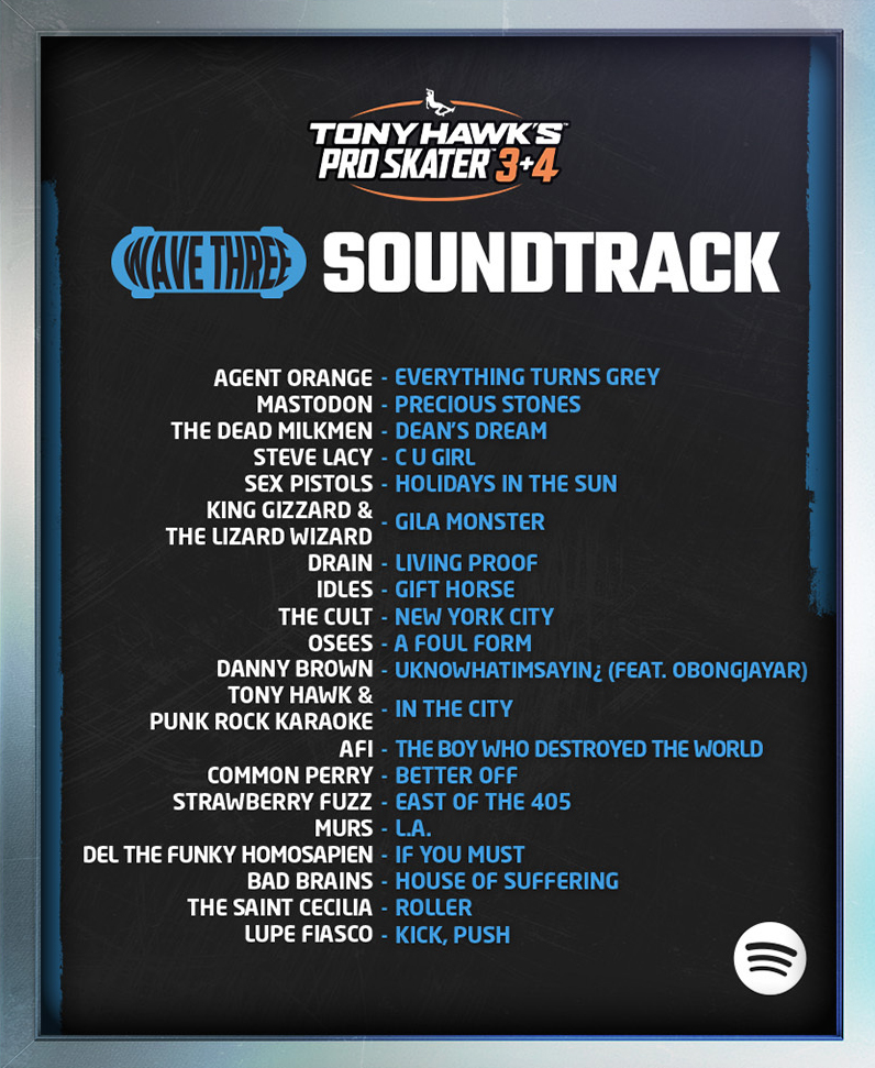 Gestern wurde die dritte und letzte Welle von neuen und alten Songs enthüllt, die in Tony Hawk`s Pro Skater 3 + 4 zu hören sein werden. Anbei eine Teilliste der dritten Welle von angekündigten Songs aus dem Soundtrack.