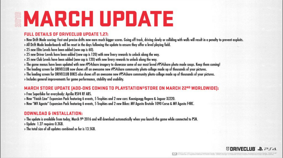 Das März Update 1.27 zu Driveclub ist online und braucht 300MB Platz.