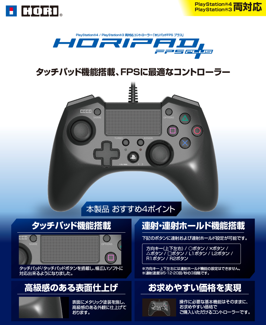 Der japanische Zubehörhersteller Hori hat einen neuen Controller angekündigt. Bei dem Horipad FPS Plus Pad handelt es sich um ein vom Xbox One inspirierten Pad für die PS4 und PS3. Neben den asymmetrischen Sticks und anderen Triggern gibt es aber auch PlayStation Besonderheiten wie das Touchpad und Hori-typisch eine Turbo-Funktion für die Tasten. Allerdings fehlen auch ein paar Sachen wie der Motion-Sensor, die Lichtleiste an der Front und einen Eingang für das Headset. Zudem ist der Controller kabelgebunden und verfügt über ein 3m Stromkabel.