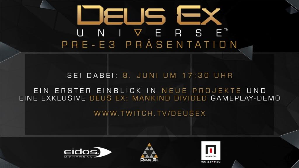 Square Enix gibt via Twitch-Livestream am 8. Juni ab 17:30 Uhr deutscher Zeit einen ersten Ausblick auf neue spannende Projekte! Zusätzlich zu den Neuankündigungen wird ein 18-minütiges, exklusives Gameplay-Video zu Deus Ex: Mankind Divided gezeigt: Werfen Sie einen ersten Blick auf das Stadtzentrum von Prag – einem weitläufigen und doch dicht bevölkerten Gebiet, in dem Spieler zahlreiche Charaktere und Nebenmissionen entdecken können.