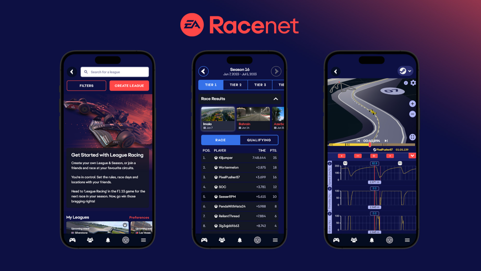 Am 25. Juli aktualisiert F1 23 die „Ligen“, eine Zusatzfunktion, mit der die Spieler über die kostenlose EA Racenet-App (verfügbar über die Homepage oder mobil für iOS und Android) benutzerdefinierte Mehrspieler-Meisterschaften erstellen, ihnen beitreten, planen und verwalten können. Die Plattform wird nun „On-Demand“-Liga-Rennen haben, die die Flexibilität ermöglichen, Rennen zu fahren, ohne ein bestimmtes Datum und eine bestimmte Uhrzeit festlegen zu müssen. Die KI wird wieder in das Line-Up aufgenommen, was individuelle KI-Einstellungen und Schwierigkeiten in jeder Liga ermöglicht. In naher Zukunft werden die Telemetriedaten über die App verbessert, so dass die Rennfahrer ihre Zeitfahrrunden nicht nur mit ihren Freunden und Rivalen, sondern auch mit professionellen Fahrern vergleichen können.