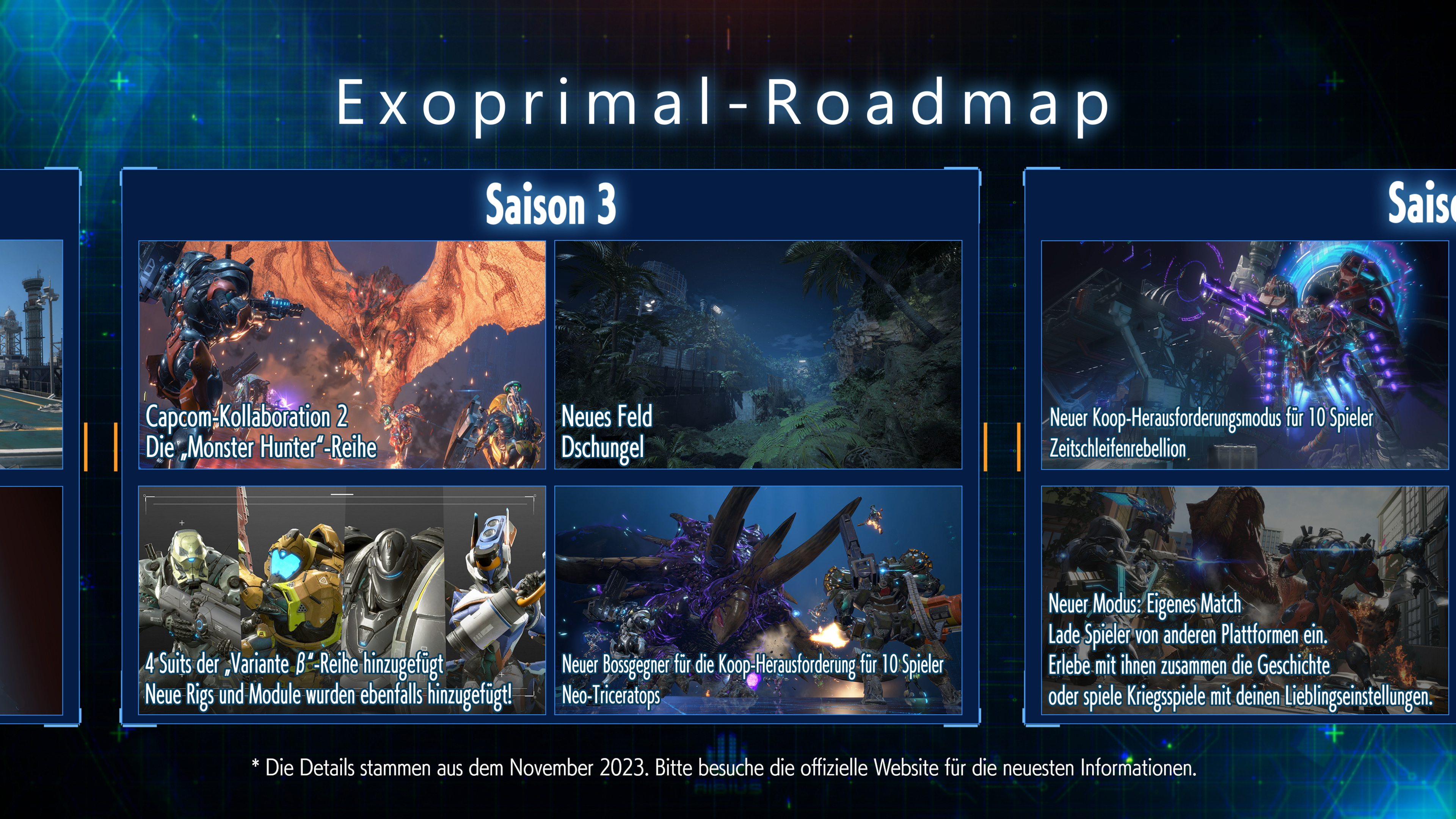 Diese Woche heißt Capcom die Saison 3 von Exoprimal willkommen. Am Donnerstag, den 18. Januar 2024, erhält das teambasierte Actionspiel sein bisher größtes Update, das die Monster Hunter-Kollaboration, neue Beta-Varianten von Exosuits, einen Neo-Triceratops-Bosskampf, die Dschungelkarte, neue Ausrüstung, neue saisonale Events und vieles mehr enthält.