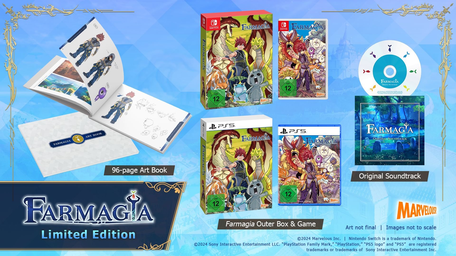 Die physische Day One Edition kann bei teilnehmenden Händlern oder über die Website von Marvelous Europe vorbestellt werden. Sie enthält eine physische Kopie von Farmagia, eine Soundtrack-CD mit 23 Arrangements aus dem Spiel und ein Artbook mit mehr als 90 Seiten Illustrationen, die alle in einer Box mit einer Originalillustration des Künstlers Hiro Mashima (Fairy Tail und Edens Zero) untergebracht sind.