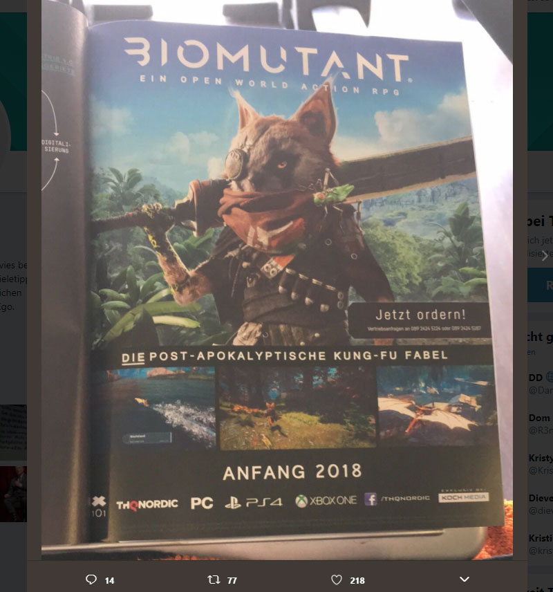 Und Schwupps, da ist sie hin die Überraschung! Pünktlich zur Gamescom 2017 wollte THQ Nordic nämlich ein neues Spiel enthüllen. Dumm nur, dass man schon vorher eine Werbeanzeige im Branchenmagazin Gamesmarkt geschaltet hat. BioMutant soll bereits Anfang 2018 erscheinen und ist eine Open World Action RPG Kung-Fu Fabel mit augenscheinlich tierischen Charakteren. Entwickelt wird das Ganze von Experiment 101, einem kleinen und frischen schwedischen Studio.