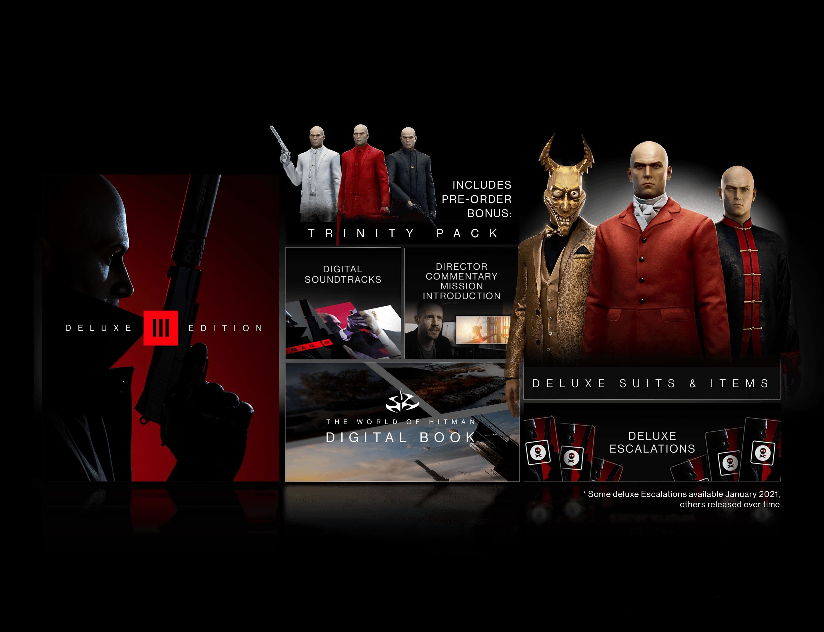 Alle Spieler, die eine Version von Hitman 3 bei teilnehmenden Händlern vorbestellen, erhalten das "Trinity Pack", das 9 Ingame-Gegenstände enthält – darunter Anzüge, Aktentaschen und Waffen aus der gesamten "World of Assassination"-Trilogie. Neben diesen Vorbesteller-Boni erhalten Spieler, die eine Einzelhandelsversion der Deluxe Edition von kaufen, zusätzlich Zugriff auf exklusive Inhalte im Spiel sowie Blicke hinter die Kulissen. Darunter Folgendes: