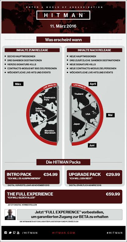 Das komplette HITMAN Erlebnis, mit sämtlichen Inhalten und Erweiterungen, Zugang zu allen Live-Events und Teilnahme an der HITMAN Beta (nur auf PlayStation 4 und PC) wird zum Preis von EUR 59,99 erhältlich sein. Das ab November 2015 vorbestellbare Intro Pack beinhaltet sämtliche, zum Launch am 11. März 2016 erhältlichen Aufträge, Orte und die dazugehörigen Live Events und wird zum Preis von EUR 34,99 erhältlich sein. Das Upgrade-Pack ist für EUR 29,99 erhältlich und erweitert das Intro-Pack mit allen noch folgenden Inhalten.