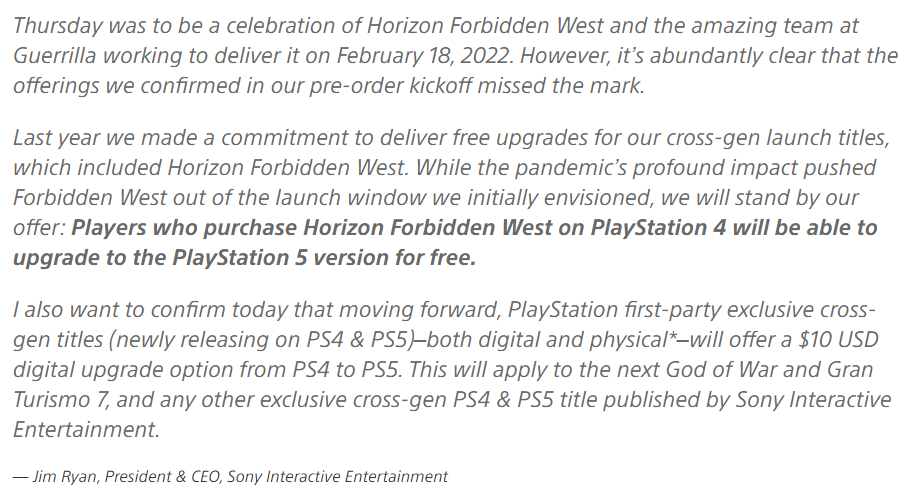 Des Weiteren teilt er mit, dass in Zukunft alle Cross-Gen-Titel die von Sony veröffentlicht werden (z.B God of War und Gran Turismo 7) eine Möglichkeit beinhalten werden um 10 $ auf die PS5 Version upzugraden. Dies gilt für Digitale und physisch gekaufte Spiele.