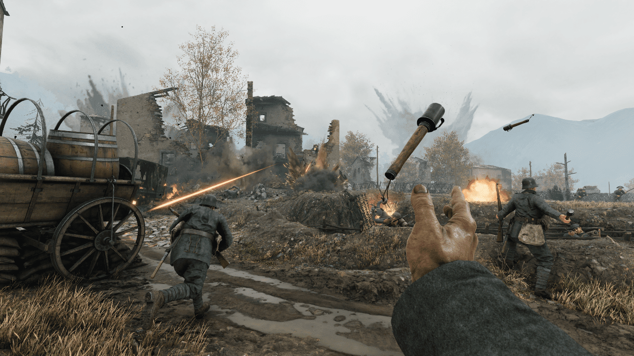 Im Offensive-Spielmodus von Isonzo kämpfen sich die Spieler durch mehrere verschiedene Karten, um zu bestimmen, wer die Offensive insgesamt gewinnt oder verliert. Die erste Karte der Caporetto-Offensive ist ein Hügelangriff bei regnerischem Herbstwetter, bei dem die deutsche Armee durch die Ruinen einer stark beschossenen Stadt vorrücken und dann mehrere in steile Hänge gegrabene Schützengräben erobern muss.