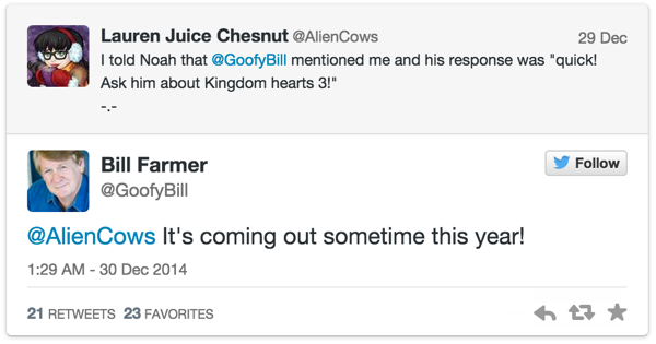 Denn der Synchronsprecher von Goofy, Bill Farmer, hat jetzt auf twitter bekannt gegeben, dass er mit den Arbeiten an der Synchronisierung fertig sei. Zudem wurde ihm aber mitgeteilt, dass Kingdom Hearts 3 noch dieses Jahr erscheinen soll. Hoffentlich irrt sich der gute Mann nicht.
