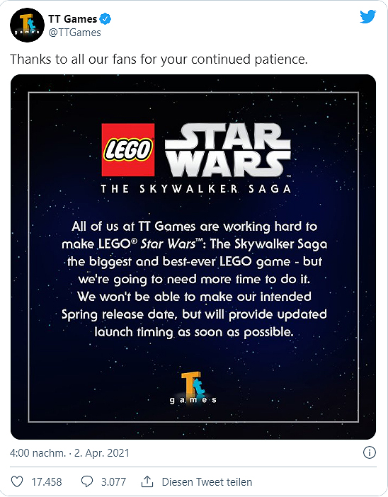 Eigentlich sollte LEGO Star Wars: Die Skywalker Saga in diesem Frühjahr für die PS4 und PS5 erscheinen, doch daraus wird jetzt nichts. Via Twitter wurde bekannt gegeben, dass das angepeilte Releasefenster nicht gehalten werden kann. Schließlich wollen die Entwickler das bestmögliche LEGO Videospielerlebnis bieten.