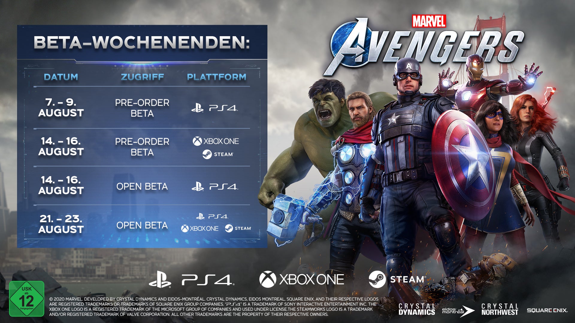 Das Beta-Programm von Marvel's Avengers begann am 7. August exklusiv für Besitzer der PlayStation 4, die das Spiel vorbestellt haben, und war dann bis 9. August verfügbar. Am 14. August wird die Beta für alle Besitzer der PlayStation 4 verfügbar sein; sie läuft dann bis zum 16. August.