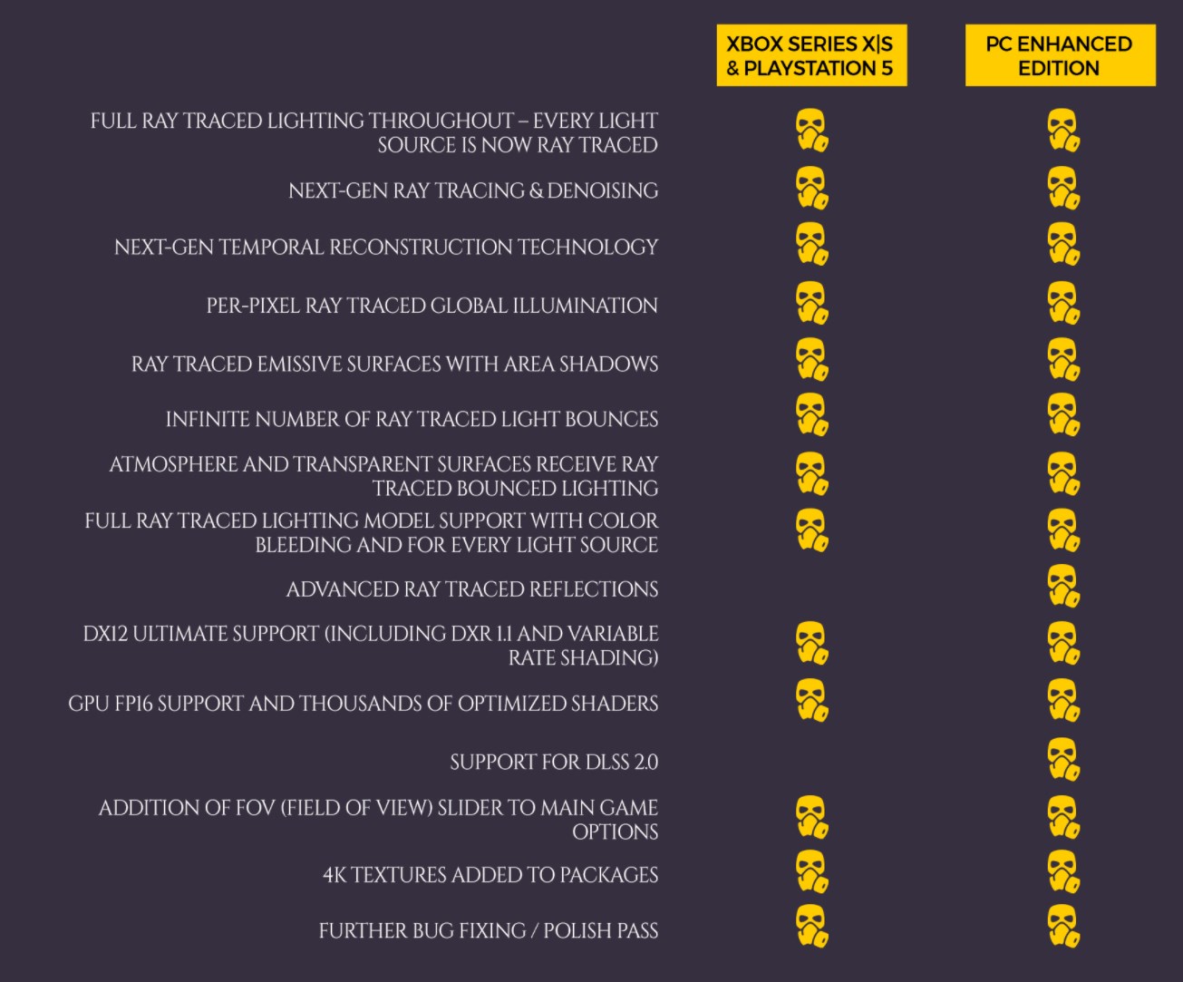 Demnach wird das Spiel RayTracing mit 60 Bildern pro Sekunde bei einer 4k Auflösung unterstützen. Das RayTracing umfasst die globale Beleuchtung und andere Lichtquellen. Nur die fortgeschrittenen RayTracing Spiegelungen wird aus den Next-Gen Konsolen nicht geben. Natürlich wird auch die SSD voll ausgereizt, was die Ladezeiten dramatisch verkürzen soll und das Haptic Feedback des DualSense Controllers wird ebenfalls unterstützt. Unten seht ihr eine vollständige Auflistung der unterschiedlichen Features.