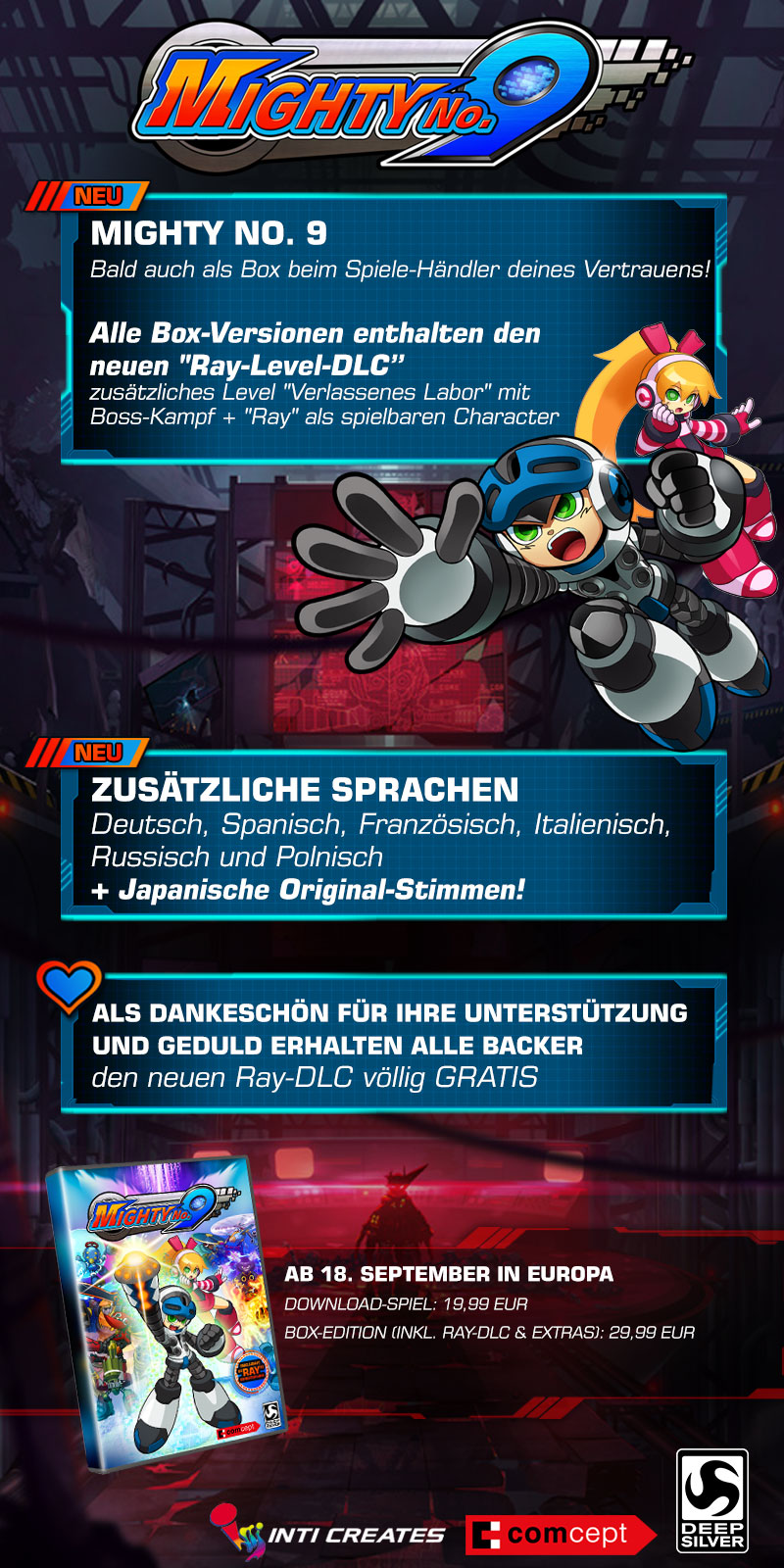 Comcept und Deep Silver haben heute ihre Partnerschaft für Comcepts anstehendes Sidescroller-Action-Game und Kickstarter-Sensation Mighty No. 9 bekanntgegeben. Mighty No. 9, erdacht von Keiji Inafune, dem "Vater von Mega Man", Comcept und dem japanischen Co-Entwickler Inti Creates, erscheint am 15. September 2015 in Amerika und am 18. September 2015 weltweit als Downloadversion sowie als physikalische Version im stationären Handel für ua. PlayStation 4 und ausschließlich als Downloadversion für PlayStation 3. Eine Handheld-Versionen für PlayStation Vita wird zu einem späteren Zeitpunkt veröffentlicht.