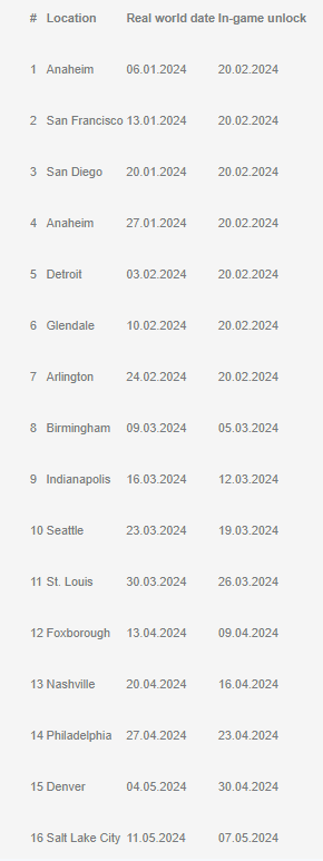 Der erste Content Drop wird die folgenden Strecken beinhalten: Anaheim, San Francisco, San Diego, Anaheim 2, Detroit, Glendale, und Arlington. Alle folgenden Strecken werden 4 Tage vor dem realen Rennereignis im Spiel freigeschaltet.