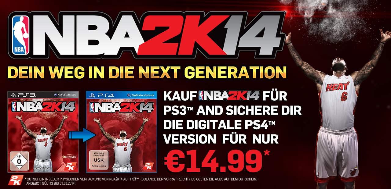 Das digitale Upgrade für PlayStation 4 wird mit einzigartigen PlayStation Network-Codes einlösbar sein, die allen im Einzelhandel erhältlichen verpackten Kaufversionen von NBA 2K14 für PlayStation 3 beiliegen, solange der Vorrat reicht. Das Angebot endet am 31. März 2014.