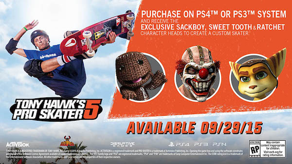Activision hat nun wieder ein paar Neuigkeiten zu Tony Hawk`s Pro Skater 5 bekannt gegeben und so dürfen sich PlayStation-Fans darauf freuen ihre Skater mit einem Ratchet, Sweet Tooth oder Sackboy Gesicht auszustatten. Ansonsten konzentrierte man sich aber auf den Online-Modus, der übrigens in der PS3 Version fehlen wird. Auf der PS4 wird man aber mit bis zu 20 Spielern in Freeskate Leveln frei nach Schnauze herumfahren können, um sich zwischen Leveln und Missionen die Zeit zu vertreiben. Mit dem Session Menü kann man dann seine Party organisieren und neue Events erstellen, die entweder nur von der eigenen Party gefahren werden oder alle im Freeskate Level betreffen.