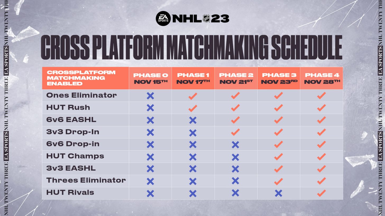 Electronic Arts gab bekannt, dass plattformübergreifendes Matchmaking in NHL 23 nun möglich ist. Das von den Fans lang erwartete Feature gibt die Möglichkeit, gegen ein anderes Team der Konsolengeneration anzutreten und verkürzt die Wartezeiten durch die Vergrößerung der Spielerpools in Hockey Ultimate Team und World of Chel.