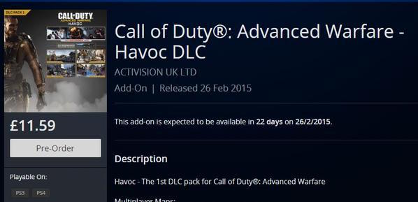 Im PlayStation Store ist still und heimlich unter "bald verfügbar" der erste DLC für Call of Duty Advanced Warfare zum Vorbestellen hochgeladen worden. Demnach können PS3 und PS4-Spieler den "Havoc"-DLC am 26.2. aus dem Store laden. Dieser beinhaltet eine neue Waffe (das Lasersturmgewehr AE4), 4 neue Karten für den Versus-Mehrspielermodus und den Zombie-Exo-Modus.