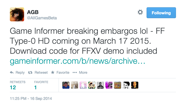 Wie Game Informer berichtet wird Square Enix im kommenden Jahr eine offizielle Demo zu Final Fantasy XV veröffentlichen. Der Name der Demo lautet "Episode Duscae". Und obwohl die Demo nur einen Anfangsbereich des Spiels zeigen wird, wird es auch Features aus dem späteren Verlauf des Spiels geben. Darüber hinaus wurde bekannt gegeben, dass die Demo auch in Form eines Download-Code in der Verkaufsversion von Final Fantasy Type-0 HD enthalten sein wird. Die US Version von Type-0 erscheint unter anderem am 17. März 2015.