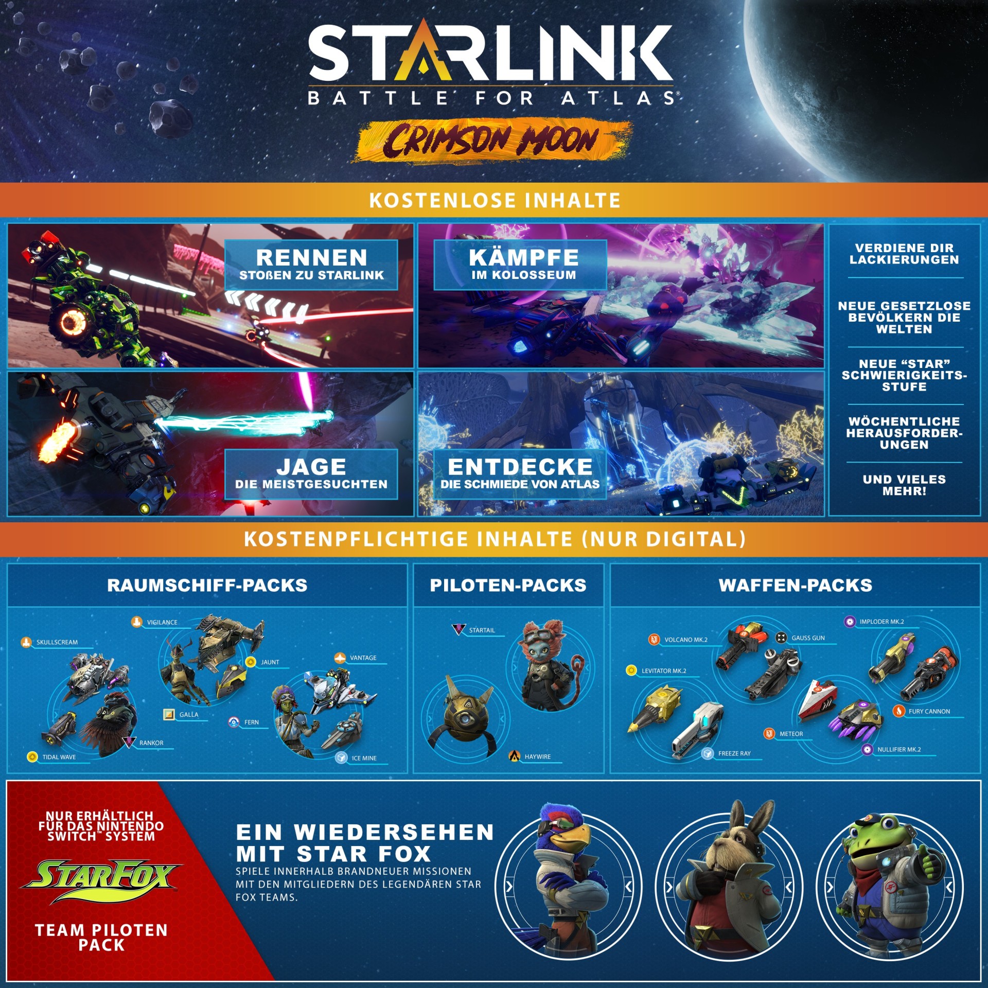 Im Rahmen des kostenlosen Updates können die Spieler von Crimson Moon die Arena der Outlaw Games erkunden. Außerdem können sie auf brandneuen Einzel- und Zweispieler-Rennstrecken mit geteiltem Bildschirm antreten, im Crimson Kolosseum gegen Wellen von rücksichtslosen Feinden kämpfen und ihren Rang und ihre Statistiken in den Ranglisten verfolgen. Der Crimson Moon wird sich auf die ganze Welt von Atlas auswirken und bietet die Möglichkeit Spieler an neuen Story-Missionen und wöchentlichen Herausforderungen teilnehmen zu lassen. Zusätzlich können die Spieler ihre Crew erweitern und den neuen Crimson Moon Inhalt mit fünf neuen Piloten, drei neuen Raumschiffen und elf neuen Waffen durchspielen, welche separat und rein digital erhältlich sind.