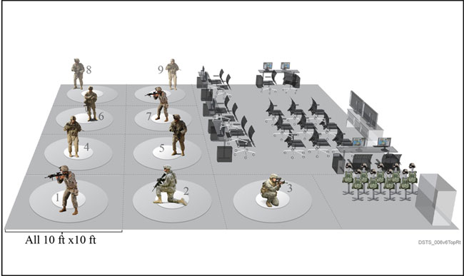 Krieg wird immer mehr zum Videospiel. Nicht nur dank neuester Technologie (ferngesteuerte unbemannte Dronen, Head Up Display in Helmen usw.), sondern auch durch neue Trainingsmethoden der Armee. Die amerikanischen Streitkräfte experimentieren schon lange mit Videospielsimulationen herum, um realistische Einsatzbedingungen zu schaffen und komplette Schlachtfelder zu simulieren. Dabei wird nicht nur die neueste Technologie (Cry Engine 3) eingesetzt, sondern auch allerlei Sensortechnik (Dismounted Soldier Training System (DSTS)). Trainiert wird dabei in einem 360° Umfeld auf 10 x 10 Fuß Pads (siehe Bild unten). Das ganze Projekt kostet 57 Millionen US Dollar und soll bereits Anfang nächsten Jahres eingesetzt werden.