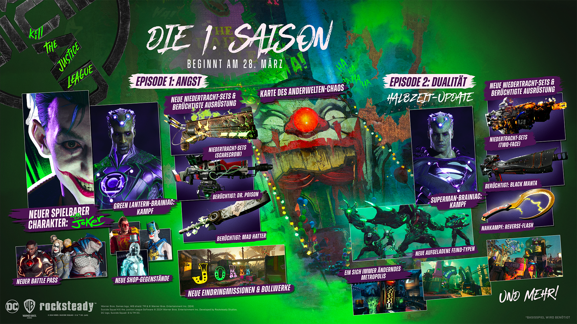 Die erste Saison voller kostenloser Inhalte zum Herunterladen (DLCs) wird am 28. März für alle, die Suicide Squad: Kill the Justice League besitzen, ohne zusätzliche Kosten verfügbar sein. Saison 1 beginnt damit, dass die Suicide-Squad-Mitglieder Harley Quinn, Deadshot, Captain Boomerang und King Shark in eine von Brainiac attackierte Elseworld teleportiert werden, um eine alternative Version des Jokers zu retten und zu rekrutieren. Diese Elseworld-Version des ikonischen DC-Superschurken wird der neueste spielbare Charakter sein, der sich Task Force X anschließt. Er hat seine ganz eigene Art von Chaos und Wahnsinn im Gepäck und kann eine große Menge Sprengstoff sowie einen raketenangetriebenen Regenschirm einsetzen, um sich durch die Luft zu manövrieren und über die Stadt zu gleiten. Sämtliche Inhalte von Saison 1 finden zudem vor dem Hintergrund einer sich stetig im Wandel befindlichen Elseworld-Version von Metropolis statt, deren verzerrte Landschaft durch die Vorstellung des Jokers neu modelliert wurde.