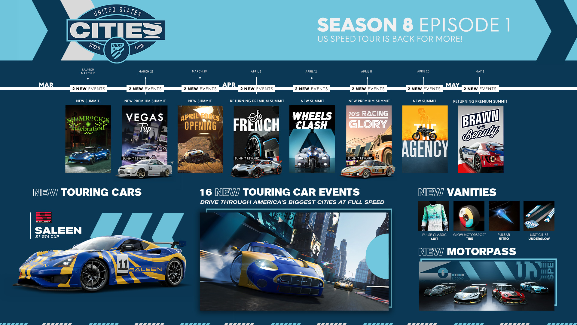 Auch der Shop wird mit neuen Fahrzeugen wie dem Saleen S1GT4 Cup (Tourenwagen), dem Spyker C8 LaViolette GT2-R (Tourenwagen) und dem KTM X-BOW GT2 (Tourenwagen) am 15. März weiter wachsen. S8E1 bietet außerdem neue Anpassungsoptionen mit 40 neuen Prestigeobjekten, einschließlich Avatar-Outfits, Rauch, Reifen, Unterbodenbeleuchtung, Scheibentönung und mehr.