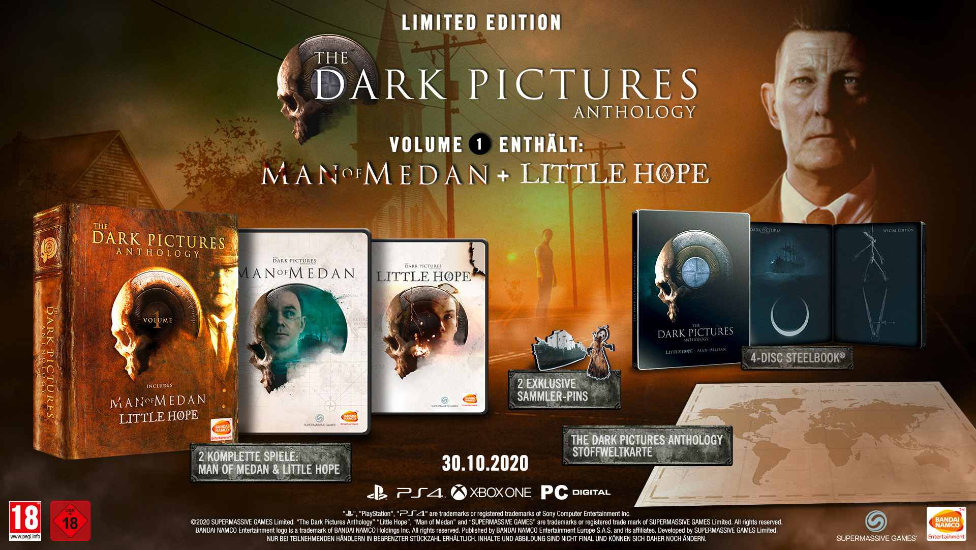 - Das Limited-Edition Bundle, das nur bei teilnehmenden Händlern erhältlich ist, beinhaltet die Spiele Little Hope und Man of Medan, eine Stoffkarte, zwei Sammler-Pins und ein Steelcase mit vier Fächern