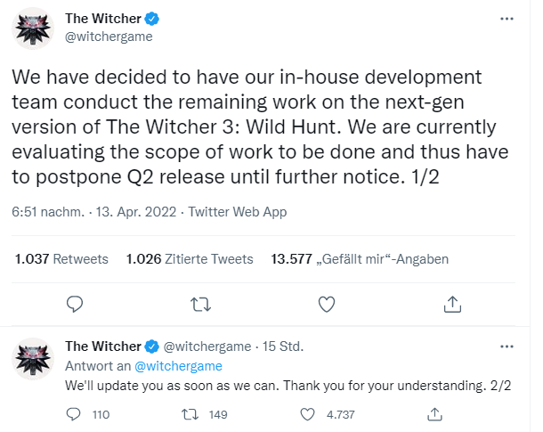 Eigentlich wollte CD Projekt (bereits nach einer Verschiebung) The Witcher 3 diesen Sommer mit einem Next-Gen Update versorgen. Doch daraus wird erst einmal nichts. Via Twitter teilte der Entwickler mit, das die Portierungsbemühung auf ein In-House Team übertragen wurden. Dadurch muss erst einmal wieder evaliuiert werden, was alles an Arbeit noch wartet bzw. was noch gemacht werden muss.
