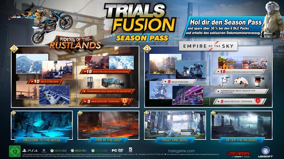 Ubisoft enthüllte heute weitere Details zum Season Pass von Trials Fusion, dem beliebten Plattform-Racer von RedLynx. Das erste von sechs herunterladbaren Packs für Trials Fusion, „Riders of the Rustlands“, wird Spielern ab dem 29. Juli zugänglich sein. Jedes Pack ist einzeln zu einem Preis von je 4,99€ erhältlich oder zusammen als Teil des Trials Fusion Season Pass für 19,99€. Zusätzlich erhalten Käufer des Season Pass den Crater Hazmat-Anzug, ein exklusiver Ausrüstungsgegenstand für den Fahrer.