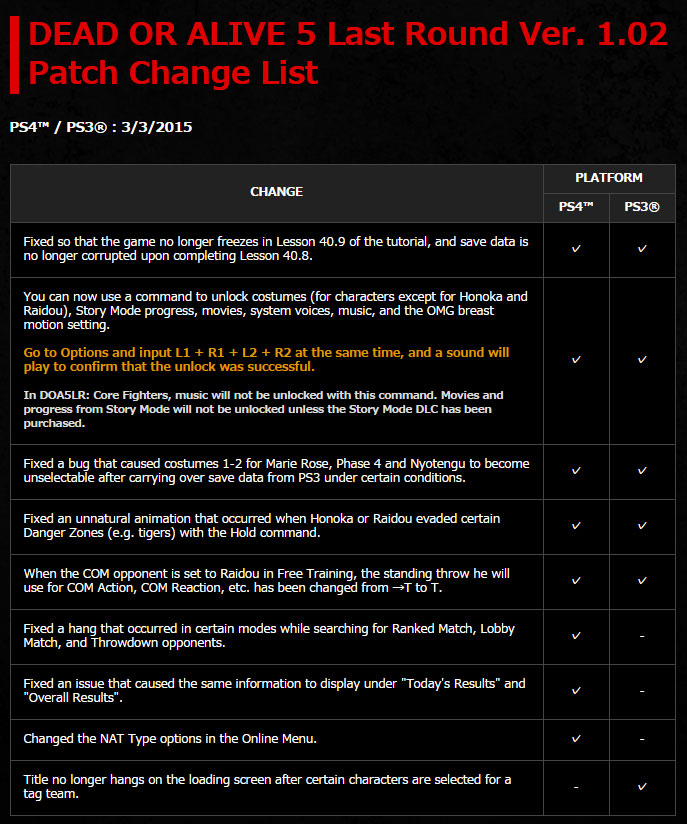 Endlich gibt es einen Patch (auf Version 1.02), der verhindert, dass Dead or Alive 5: Last Round in der Tutorial Mission 40.8 die PS4 einfriert bzw. in 40.9 das Savegame zerstört (OnPSX News). Ausserdem gibt es noch ein paar andere Verbesserungen, ua. einen Cheatmodus, der Sachen freischaltet.