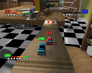 Anfangs war ich ziemlich skeptisch, schließlich war das letzte Werk der ungarischen Entwickler Supersonic Games (Mashed – OnPSX Test) ein totaler Reinfall. Sowohl spielerischer als auch technischer Natur. Als dann Codemasters Micro Machines V4 ankündigte, konnten mich die ersten Screenshots auch nicht beeindrucken. Ein schlechtes Omen? Nein, denn Micro Machines V4 macht einfach nur einen mordsmäßigen Gaudi und erinnert frappierend an die alten Micro Machines Granaten auf dem Mega Drive. Mit den namensgebenden Miniaturautos (wovon es im fertigen Spiel über 800 Stück gibt) heizt man auf Küchentischen entlang, durch Hühnerställe und über Häuserdächer. Kann man seinen Vorsprung gegenüber dem Gegner weit genug ausbauen, gewinnt man einen Punkt. Sind alle Punkte eines Spielers aufgebraucht, gewinnt automatisch der jeweils Andere. Zahlreiche Punkteboni und Waffen sorgen für ausreichend Abwechslung und Unterhaltung. Die Fahrzeuge steuern sich zwar alle gleich, aber dafür äußerst präzise und authentisch (wenn das denn überhaupt machbar ist). Besonders im Multiplayermodus ist Micro Machines V4 ein Heidenspaß. Nur technisch könnte sich noch etwas tun. Die Grafik läuft zwar immer schön flüssig, sieht aber im Gegenzug dazu nicht besonders toll aus. Niedrig aufgelöste Texturen und wenig bunte Farben, lassen das Spiel etwas zu trist für meinen Geschmack aussehen.