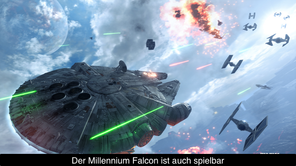 Im neuen sogenannten Fighter Squadron Modus stehen sich 10 Männer pro Team gegenüber und werden jeweils von 10 weiteren KI-Piloten unterstützt, was in der Summe 40 Flieger macht. Im Kern wird dabei Team Deathmatch gespielt und die erste Mannschaft mit 200 Punkten gewinnt, wobei man aber nur in einem Flugzeug sitzt. Dieses ist völlig freu steuerbar über eine weiten Map und bietet neben einem Maschinengewehr auch Raketen, um dem Gegner einzuheizen. Glücklicherweise kann man Gegner anvisieren, was vor allem das Raketen Abschießen vereinfacht. Überhaupt steuern sich die Flugzeuge überraschend gut, auch wenn sie etwas indirekt bzw. träge reagieren, um es nicht zu einfach zu machen. Es ist aber kein Problem ein Flugzeug auf längere Zeit zu verfolgen, auch wenn es zahlreiche Ausweichmanöver fliegt. Durch die vielen Flugzeuge im Einsatz bekommt man auch ein tolles Gefühl der Schlacht vermittelt. Wer sich aber besonders gut im Kampf schlägt, kann damit weitere, bessere Flugzeuge freischalten, wie z.B. den Millennium Falcon, der natürlich unglaublich effektiv ist und nur sehr schwer ausgeschaltet werden kann. Während des normalen Modus werden hin und wieder auch unterschiedliche Einsatzziele eingeblendet, wie z.B. das Bewachen eines Konvois, womit man weitere Punkte als Team sammeln kann.