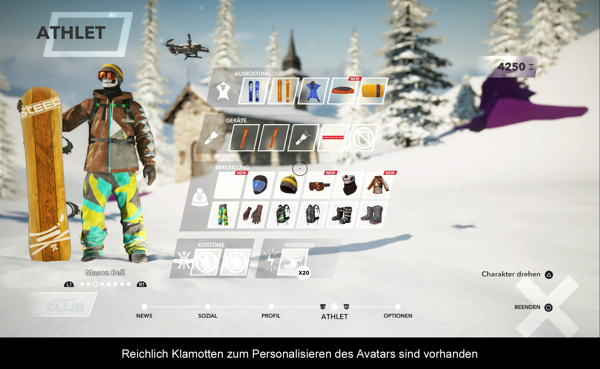 Die Entwickler haben einen realistischen Zugang gewählt. Die Steuerung ist zwar Arcade lastig, aber wer sich spektakuläre Tricks erwartet wird enttäuscht. Rampen Absprünge müssen genau gewählt sein. Hat man den richtigen Zeitpunkt verpasst, war es das auch schon wieder. Ein weiteres Problem ist die Welt Ansicht. Sie ist dermaßen verwinkelt und mit kleinen Hindernissen vollgestopft, dass man oft daran hängen bleibt. Da man nicht nach Belieben zwischen den Sportarten und zu Fuß wechseln kann, hilft oft nur ein schneller Neustart. Denn nur wenn man wirklich still steht, kann man auch wechseln. Dies bedeutet wiederum, wer auf eine spektakuläre Wingsuit-Paragleiter-Snowboard Combo aus ist, wird enttäuscht sein. Die Fortbewegung zu Fuß ist mehr als langsam und anstrengend, wie man es eben im Tiefschnee erwartet. Leider kann der Charakter keine kleineren Hindernisse erklettern oder darüber springen. Dafür gibt es eine ordentliche Kleidungsauswahl, wo man ihn von Kopf bis Fuß mit Markenmode einkleiden kann.