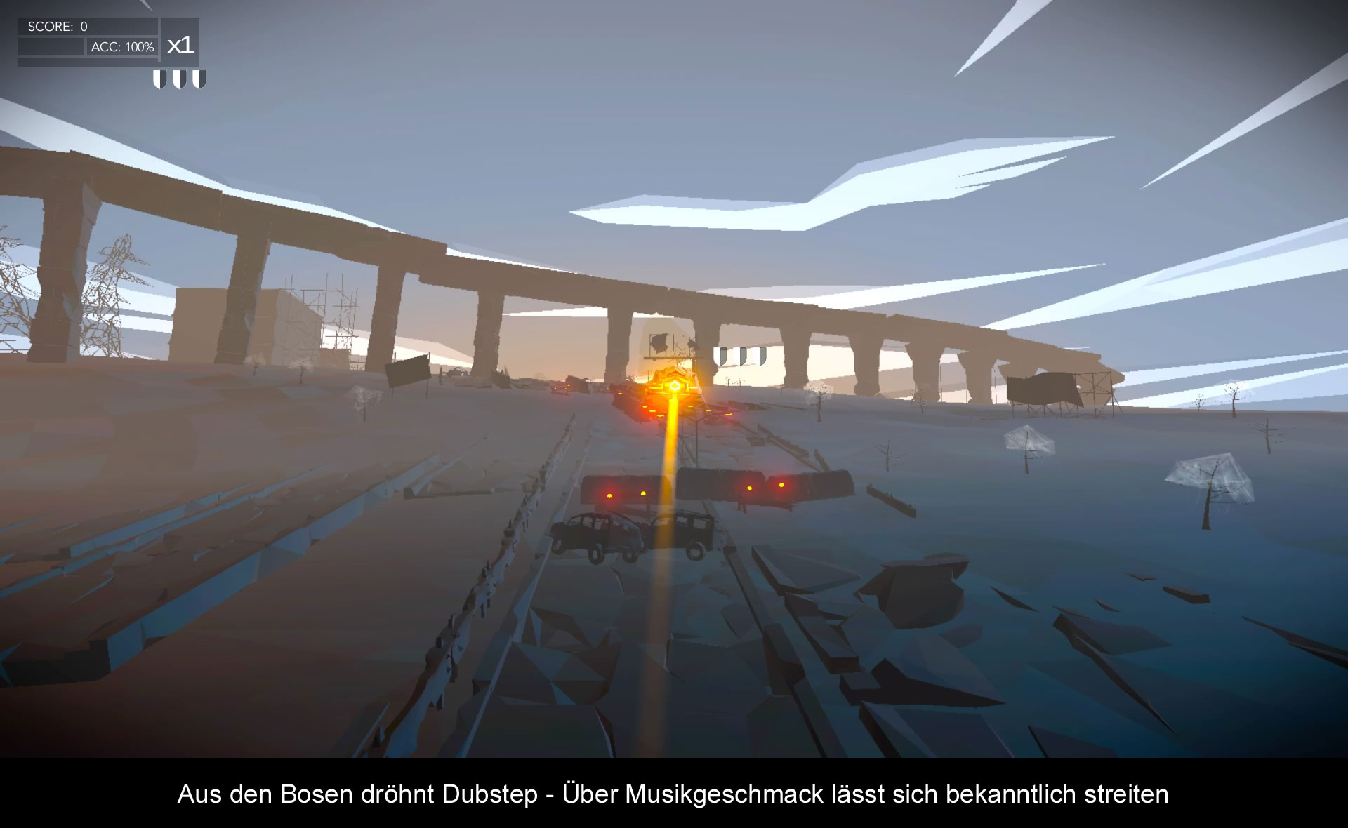 Neben den Baller-Momenten verfügt jedes Level aber auch über Röhren-artige Passagen, wo man sein Gefährt entlang einer festgelegten Linie führen muss. Hier kommt ganz klar die Inspiration von Rhythmusspielen a la Rock Band oder Amplitude zum Vorschein. So bekommt man beispielsweise umso mehr Punkte, desto länger man sich auf der Schleife hält. Verlässt man sie, wird einem Leben abgezogen, was im Schlimmsten Fall zum Game Over führen kann.
