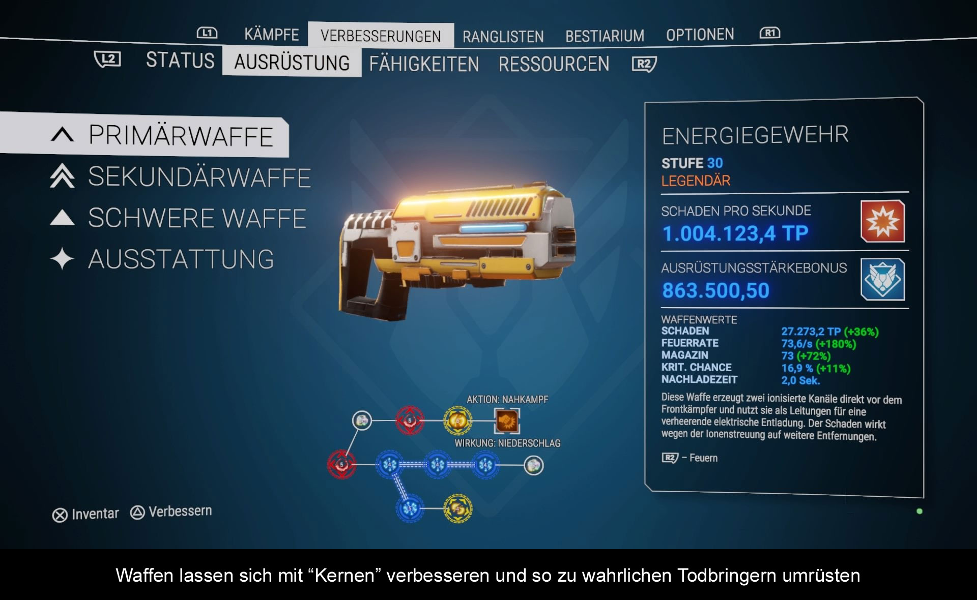 Am Anfang hat man die Auswahl zwischen drei Truppengattungen, die alle über unterschiedliche aktive und passive Fähigkeiten verfügen. Der Frontkämpfer ist der Tank, der Bio-Experten quasi der Heiler und der Saboteur der Spezialist der Truppe. Alle Klassen haben jedoch ihre Vor- und Nachteile. Leichte Rollenspielelemente gibt’s natürlich auch, jeder Avatar sammelt Erfahrung, steigt Stufen auf und darf neue Fertigkeiten erlernen. Das normale Levelcap ist bei Stufe 30 erreicht, danach kann man aber noch auf den Heldenstufen weiterzocken. Auch Beute aka Loot gibt es – verschiedene Waffentypen mit diversen Raritätslevels und dann darf man die Knarren sogar noch mit Kraftkernen aufwerten. Das macht Spaß und man kann sich dadurch schon einige mächtige Dinger basteln. Mein legendäres Plasmagewehr verteilte zum Schluss sogar locker eine Millionen Schadenspunkte. Trotzdem hätte ich mir ein wenig mehr Abwechslung gewünscht, zum Beispiel verfügen die legendären Waffen zwar über Spezialeigenschaften, aber sehen überhaupt nicht anders aus. Apropos – seinen Avatar kann man übrigens nicht anpassen. Ein toller Bonus ist jedoch das Weltenlevel, das sich zwei Mal nach dem Durchspielen (20 Missionen) erhöht. Die Umgebungen sehen anders aus, die Story geht weiter und die Gegner werden härter und das Loot besser. Nach dreimaligen Durchspielen kann man sich sogar noch (nachdem man Zugangsschlüssel gefunden hat) die großen Archenschiffe vornehmen. Hier warten besonders zähe Gegner auf die Spieler, aber auch garantierte Belohnungen (z.B. immer eine legendäre Waffe).
